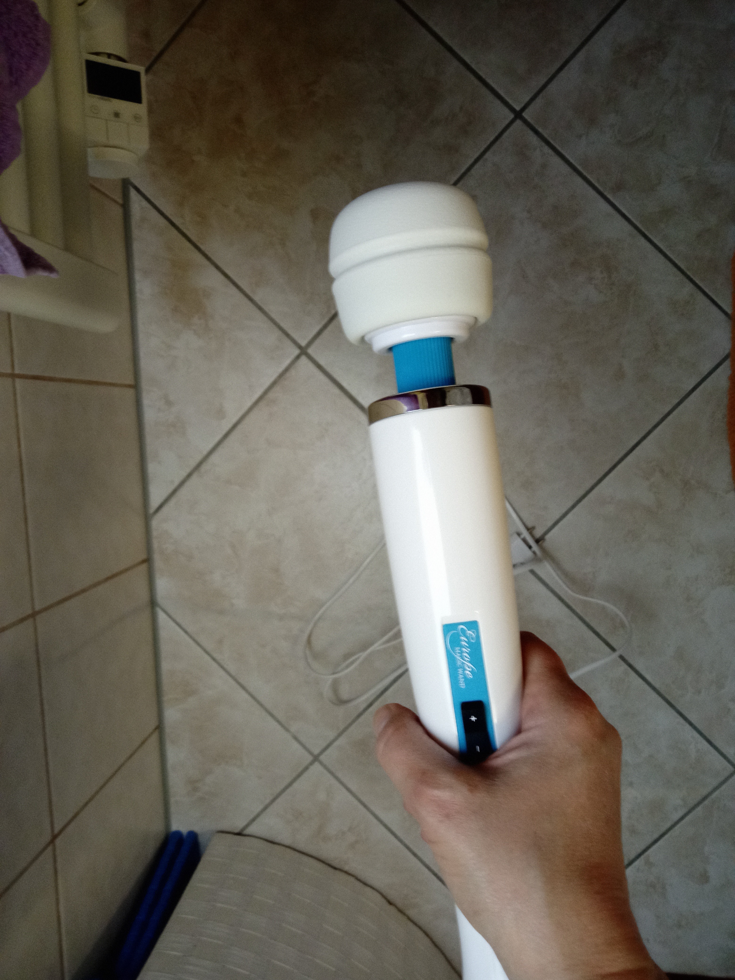 Ich benutze ihn am liebsten, indem ich mir am Kopfende des Betts aus Kissen eine 45°-Rückenlehne baue, an die ich mich anlehne und die Beine spreize, das Kabel quasi gerade zum Fußende des Betts weglaufen lasse, und in dieser Position bequem meinen Busen, Bauchnabel, Vulva, Perineum, Anus, Oberschenkel, und wenn ich mich vorbeuge auch Füße und Fußsohlen massieren kann 😍🤭😊