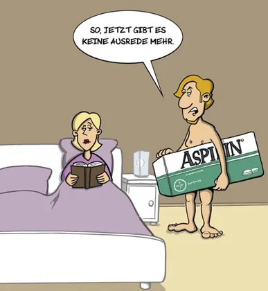 So richtig kann ich über den Witz nicht lachen. Natürlich kenne ich das aus Schlagern ("Und heut Abend hab ich Kopfweh...") aber es ist für mich ein ungeschriebenes Gesetz, dass man keine "Ausreden" braucht, wenn klar ist, dass es nur dann Sex (egal welcher Art) gibt, wenn BEIDE es wollen und auch mit der Art und Weise des Sex einverstanden sind.