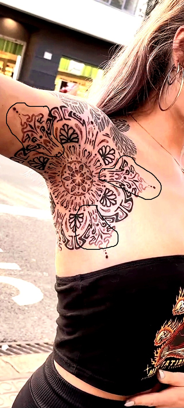 Ein neutrales Tattoo aber vielleicht wäre es besser gewesen wenn es am Rücken zu sehen ist dar es so besser zur Geltung kommt komplett. Übrigens man kann ein Gesicht erkennen wenn man genau hinsieht links Richtung Arm.