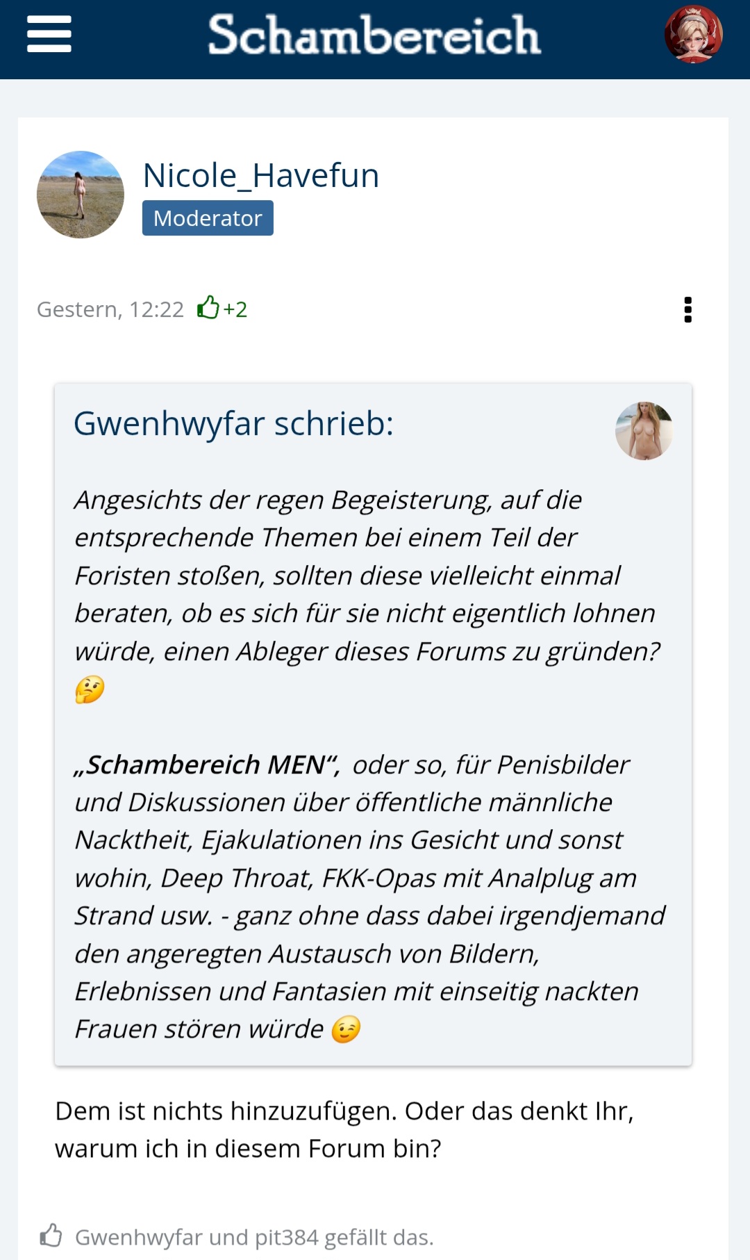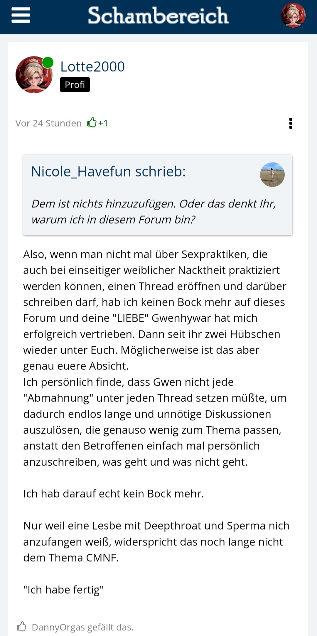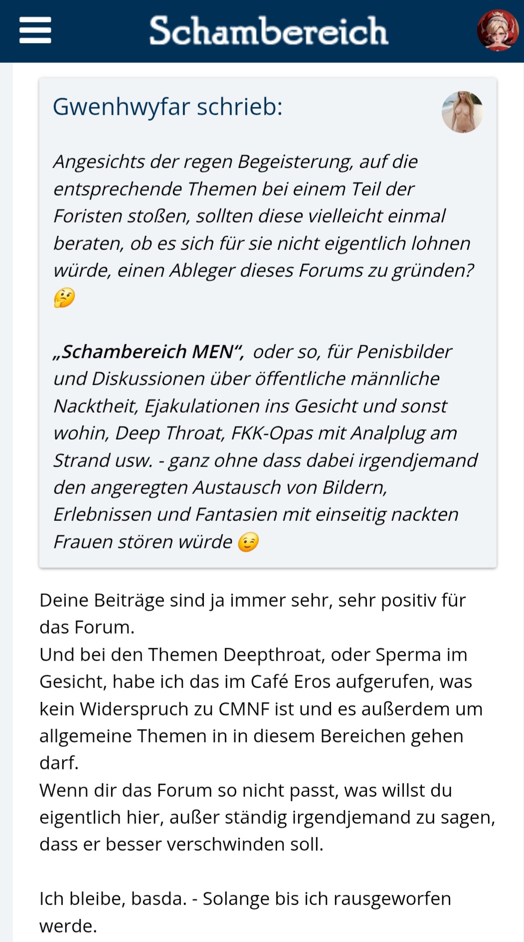 Wenn das (siehe Screenshots - Thread "Höschen runter") die feste Meinung der Moderatiorin ist, dass meine Threads Deepthroat und Gesichtsbesamung nicht mit CMNF übereingeht,