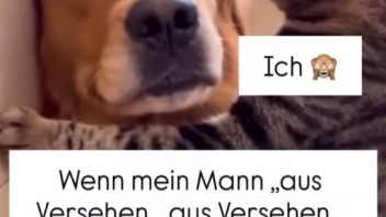 Erstaunt darüber fasst sich Ihr Freund mit einer Hand an sein Kinn und mit der anderen Hand zwischen seine Beine.